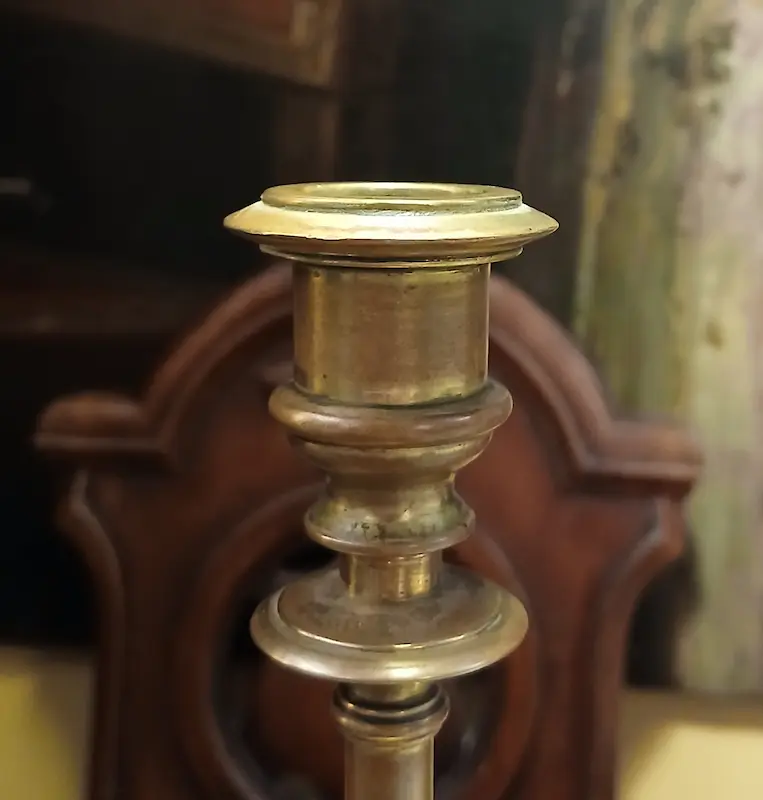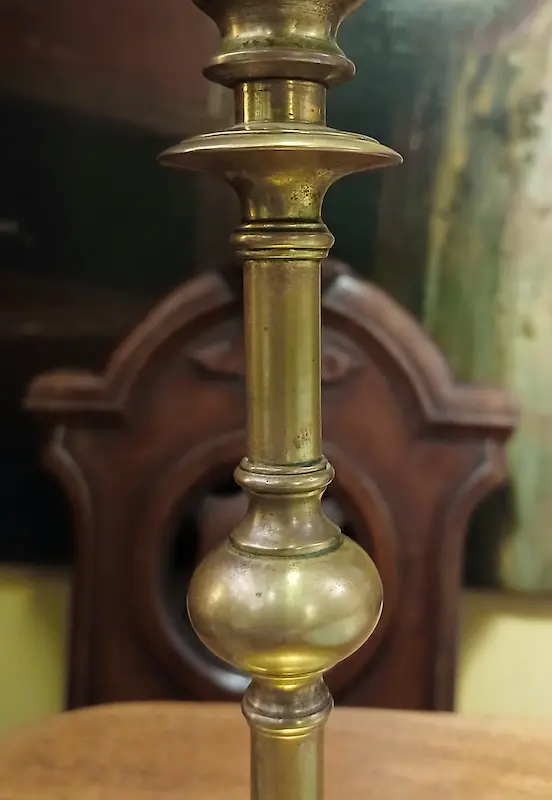 Candeliere in bronzo a stelo e anelli a balaustra, su base rotonda e modanata. Di buona qualità e condizioni.