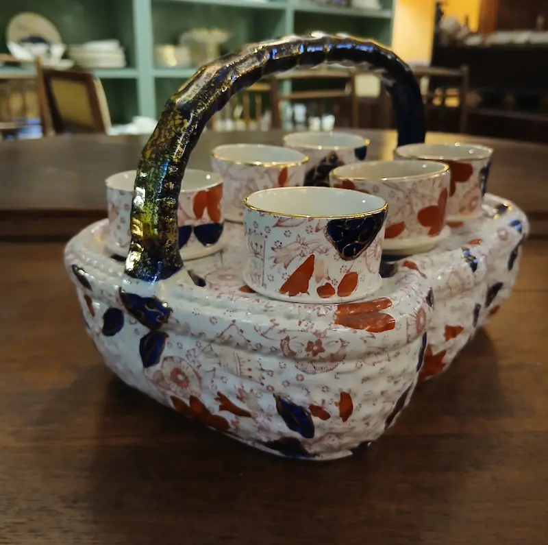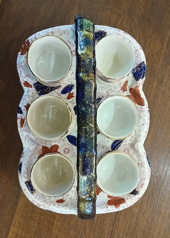Cestino per sei uova in ceramica decorato con motivi floreali, comprende 6 portauovo estraibili anch’essi decorati, Staffordshire