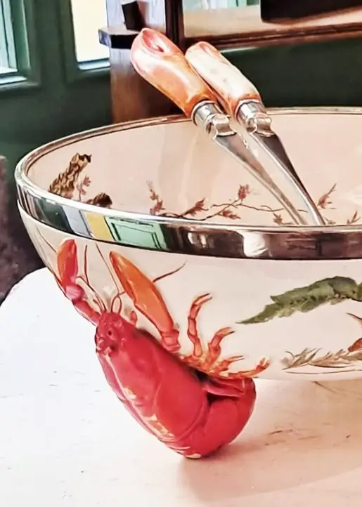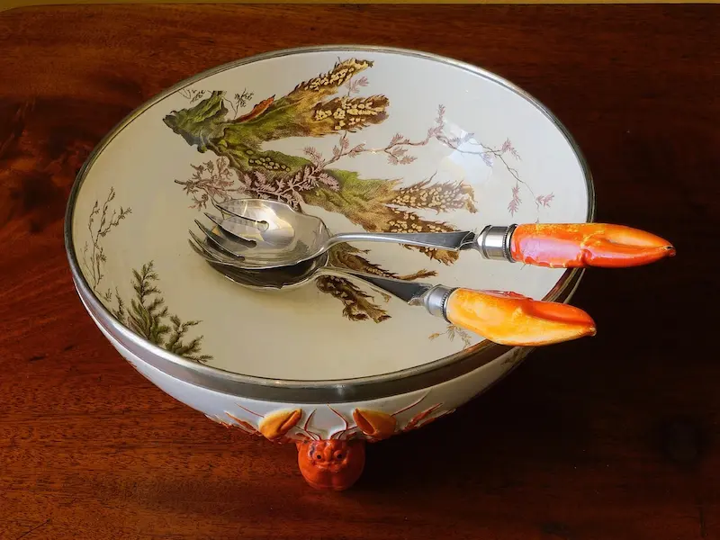 Rara Ciotola da insalata Vittoriana, con all’interno un disegno caratterizzato da varietà di grandi alghe a simulare il fondale marino che continuano anche nella parte esterna. Tre grandi astici fungono da sostegno alla ciotola.