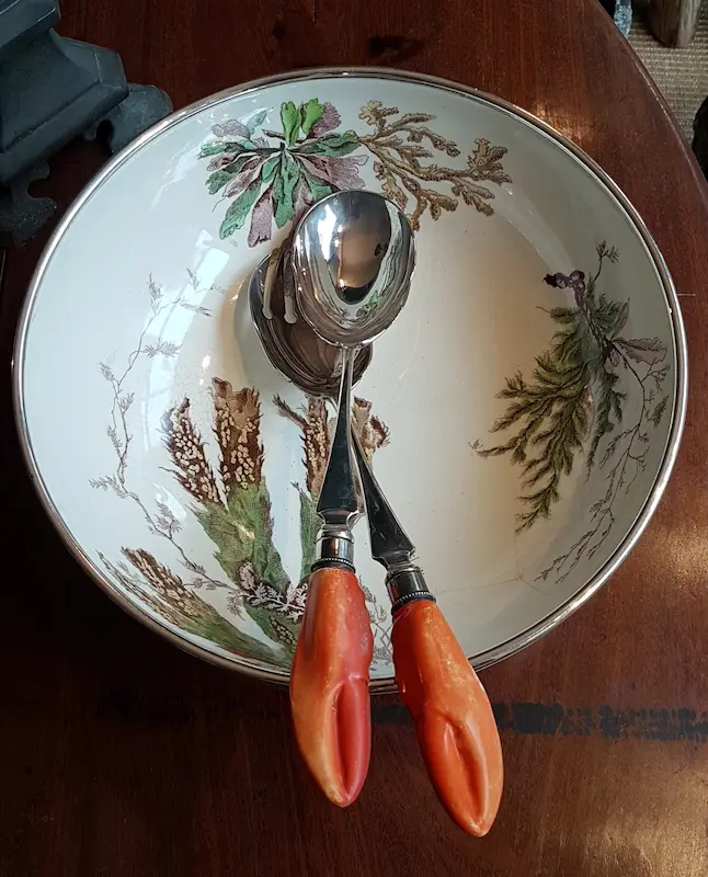 Il bordo della ciotola è rifinito con una fascia in metallo argentato. La ciotola è corredata da due posate di servizio in metallo argentato punzonate J.Dixon &Son, con manico a forma di chela in ceramica.
