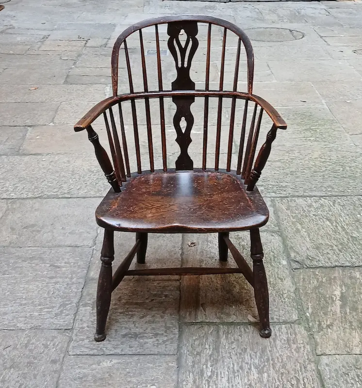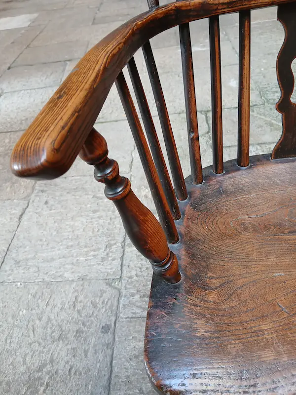 Coppia di sedie con braccioli Windsor, in legno di olmo e quercia, presentano alcune differenze nella struttura, patina originale e segni di usura.