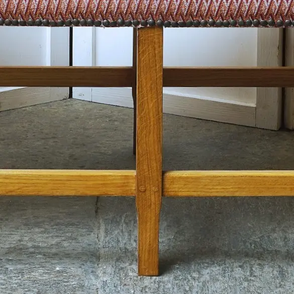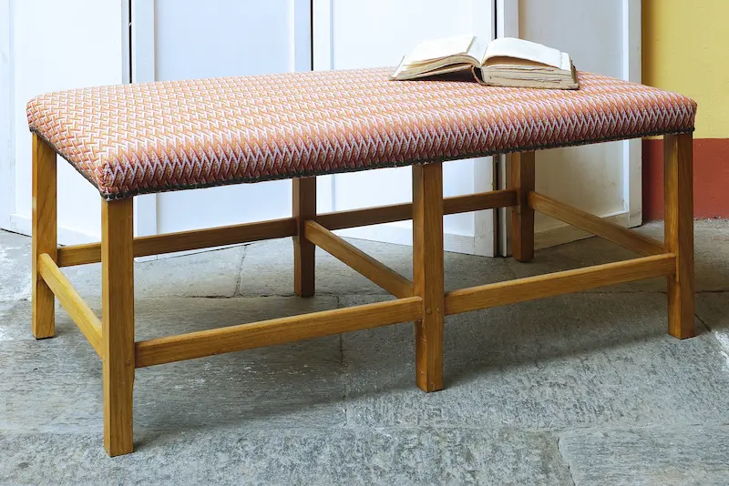 Il tradizionale panchetto imbottito da centro, a sei gambe in rovere con finitura a olio e cera d’api. Rivestimento in Tessuto disegno “ Massai” Metaphores