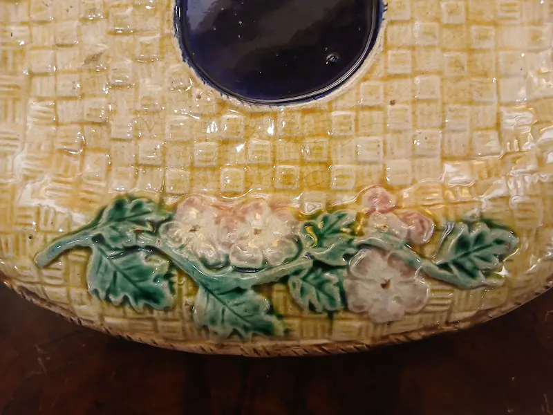 Raro piatto da pane in maiolica con motivo di cesto intrecciato e fiori di pesco in rilievo. Manifattura Minton