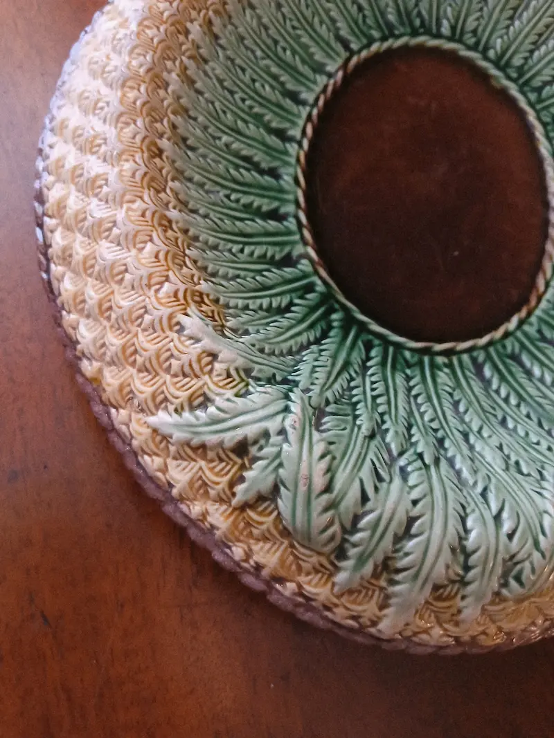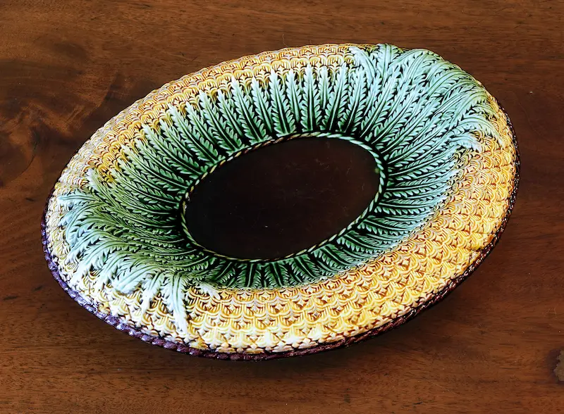 Piatto da pane in maiolica policroma con disegno a rilievo di ananas.