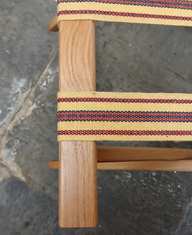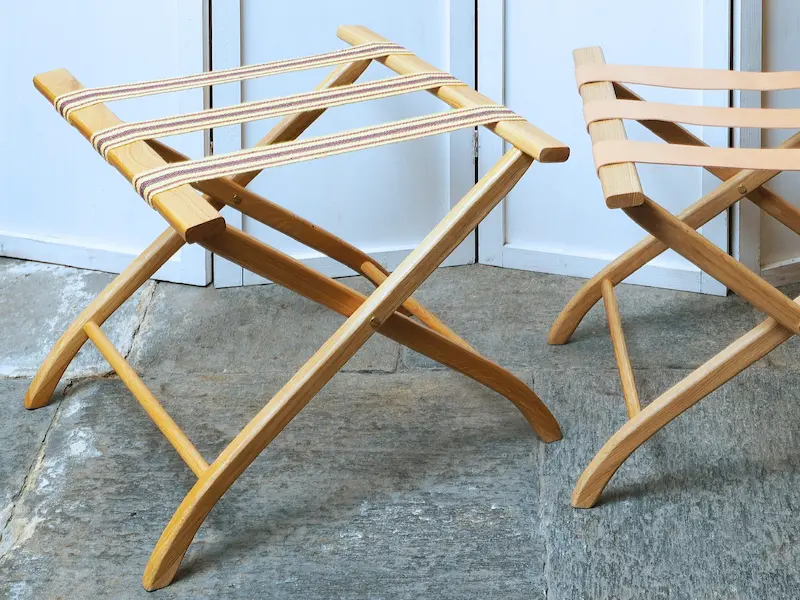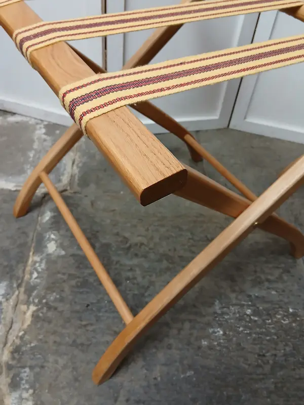 Pliant per valigia, pieghevole realizzato in legno di rovere finito a cera d’api, con cinghie in tessuto, può essere un valido supporto anche per un vassoio.