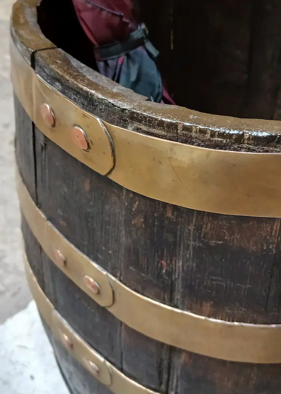 Grande portabastoni della fine dell’800 di forma ovale a botte in quercia della fine 800, con fasce in ottone rivettate. Utilizzabile anche come portaombrelli.