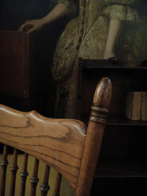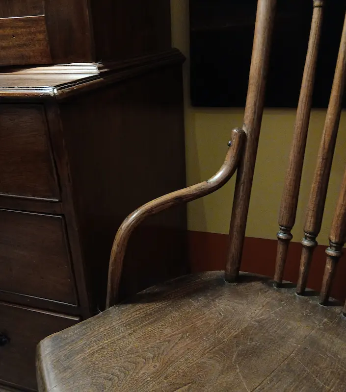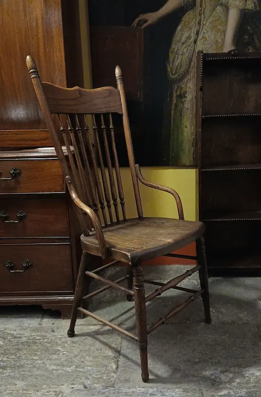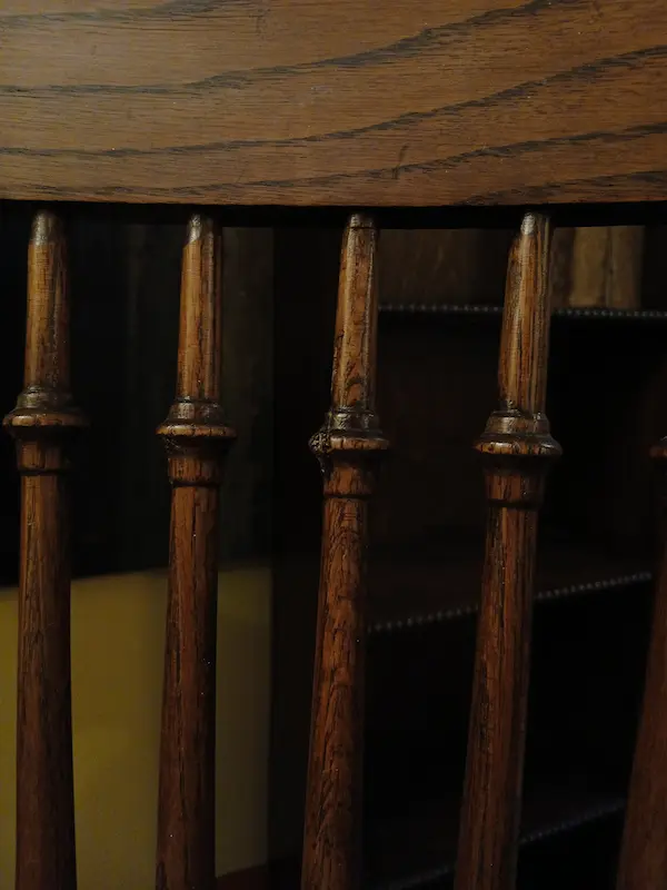 Sedia periodo Arts & Crafts con braccioli e schienale alto a doghe, in rovere, riprende lo stile di William Russell Birch.