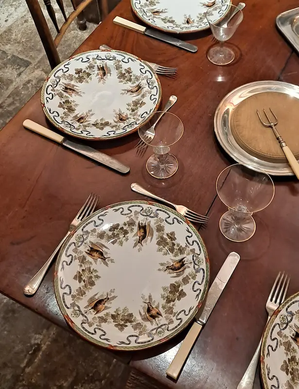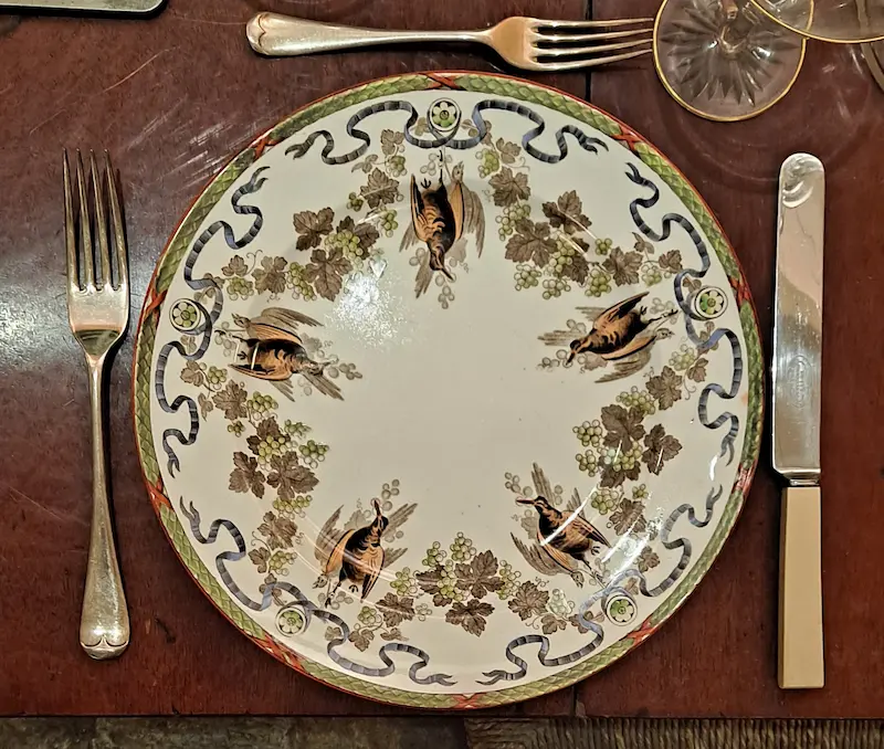Raro servizio di dieci piatti piani della manifattura Wedgwood il decoro è a decalcomania con festoni, beccacce e tralci di vite.
