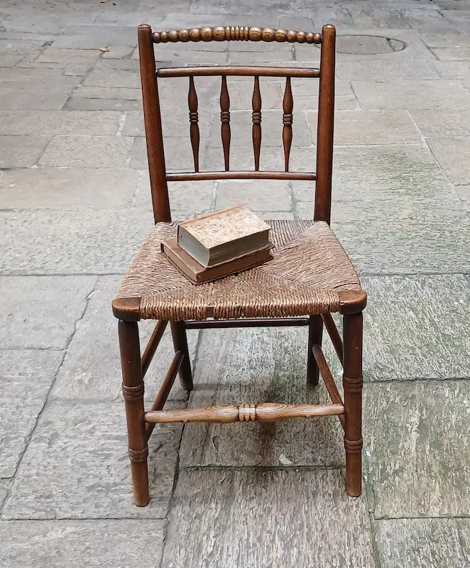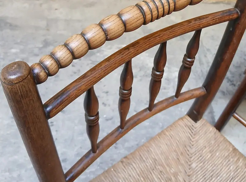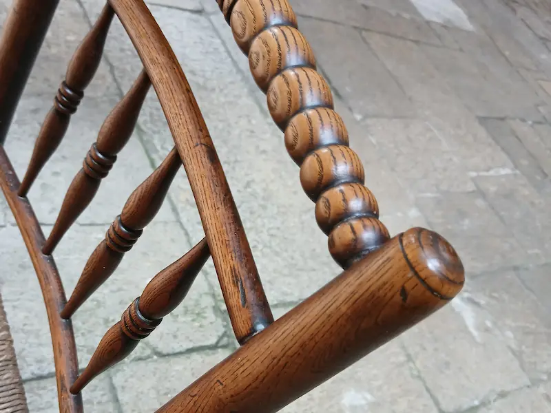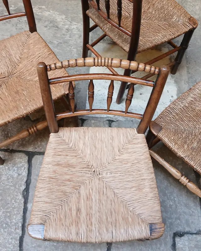 Quattro sedie in rovere con schienale a bacchette e sedili in paglia originale