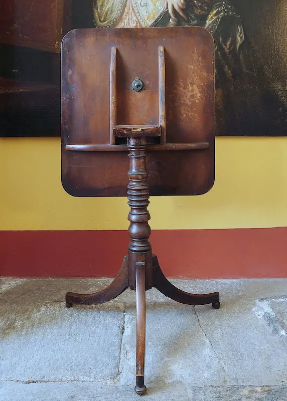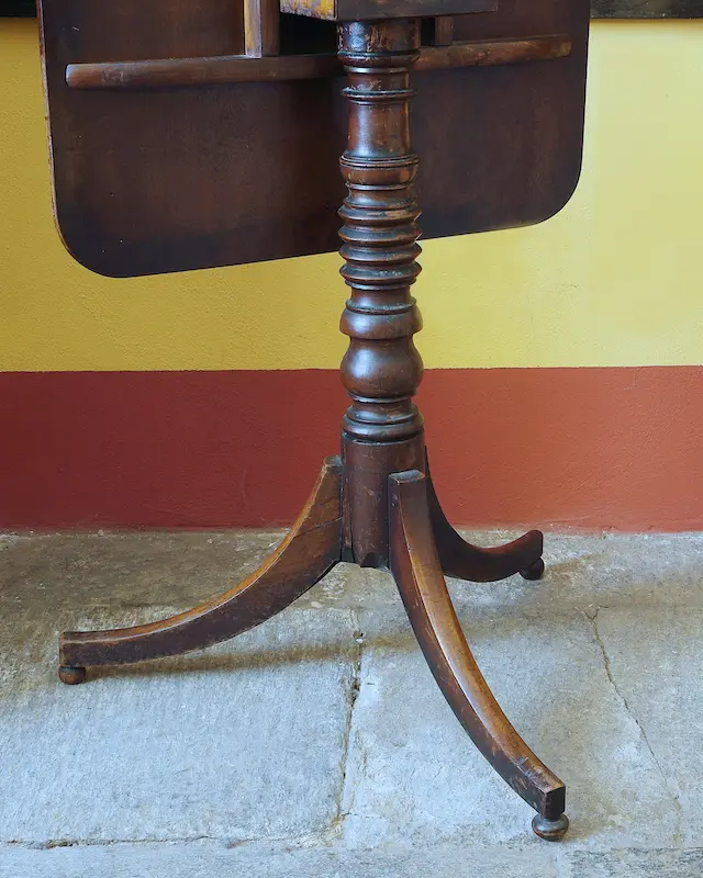Tavolino in mogano rettangolare con bordi arrotondati, sostenuto da una colonna centrale tornita e sagomata e tre gambe a sciabola ribaltabile con piccoli piedi di appoggio. Il piano presenta una patina originale e ottimo colore, ribaltabile con chiusura originale, buone condizioni per il periodo.
